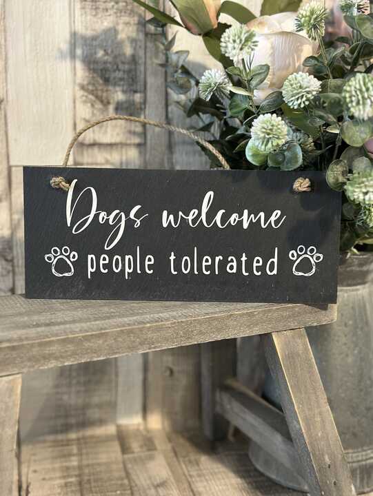 A gorgeous rustic style slate hanging plaque. 'Dogs Welcome People Tolerated' the perfect gift for any dog lover or as a treat for yourself. Approx 24 x 10 cms