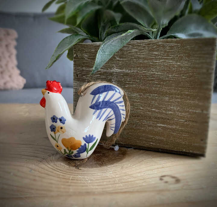 These beautiful ceramic Cockerels painted with floral illustrations are perfect for popping on your Easter tree. Floral pattern may vary slightly.