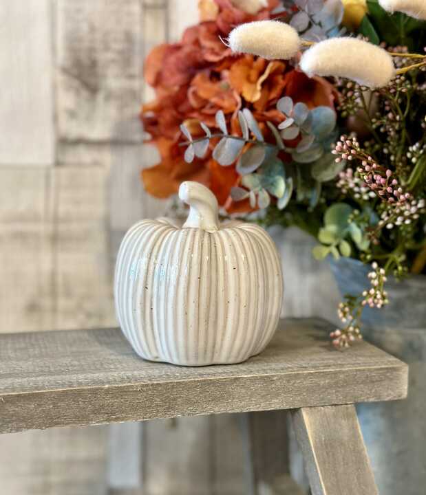 A cute rustic ceramic pumpkin with ribbed finish and natural glaze, perfect for adding a touch of Autumn to your home.