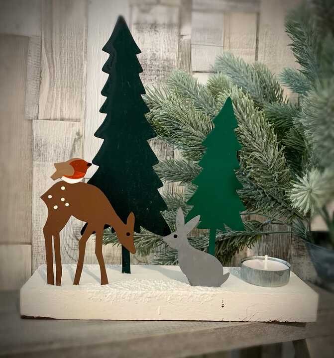 A gorgeous t light holder from Shoeless Joe - A young deer and his friend rabbit search for food in the snow covered forest, whilst a cheeky robin warms up on the deers back.