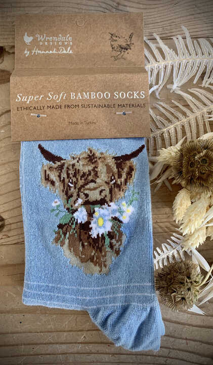 A treat for your feet, this wonderful pair of socks features a lovely highland cow stitched onto super soft bamboo material. As well as being naturally anti-bacterial, moisture wicking, super soft, warm and breathable, our socks are kind to the environment too. One size (women's) 100% Oeko-Tex Bamboo with nylon stitching. Each pair of socks comes with a beautifully illustrated gift bag making a wonderful gift.